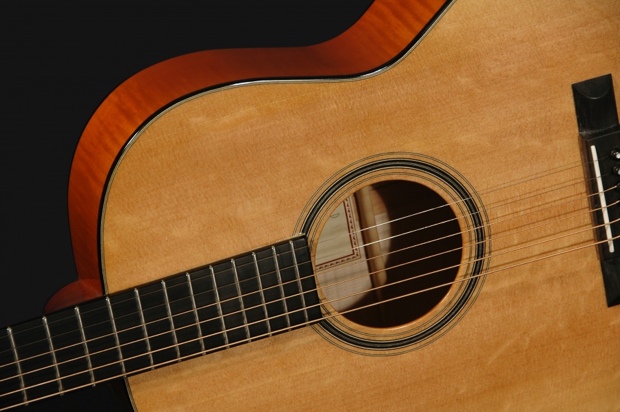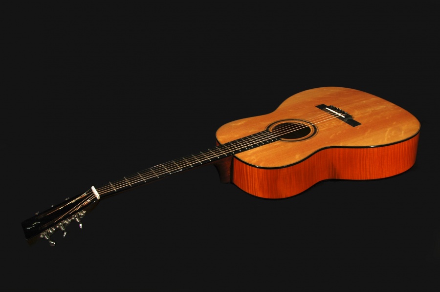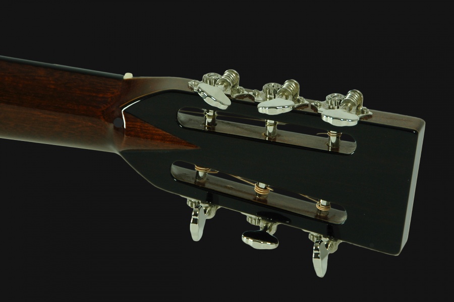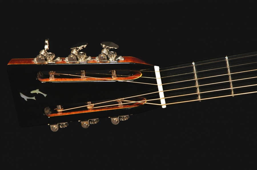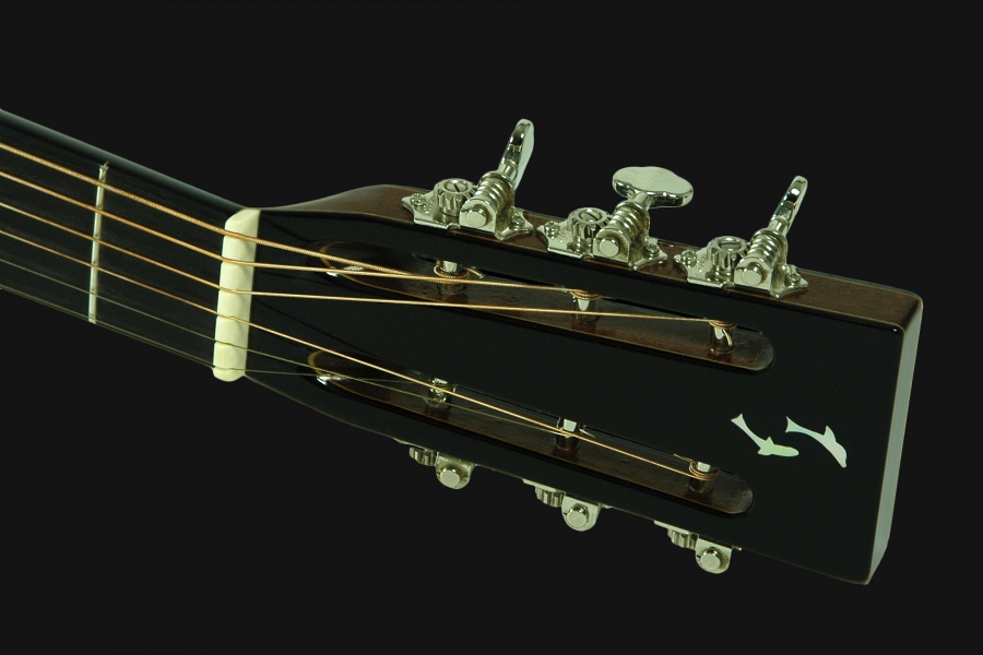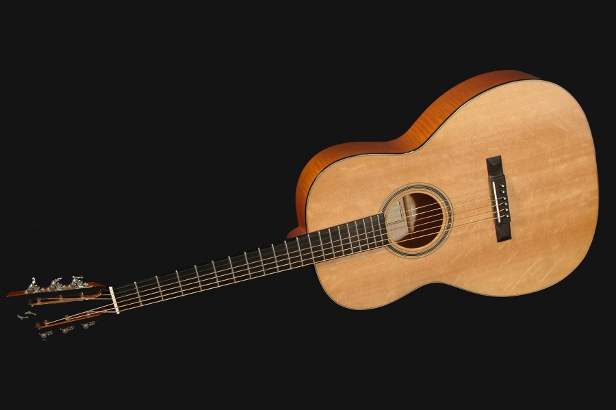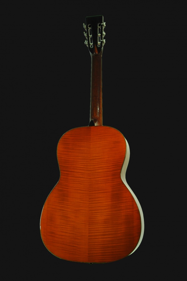 << zpětKytara je inspirovaná modelem 000 firmy Martin. Provedení celomasiv. Materiál - přední deska - smrk sitka, zadní deska a luby - vlnkovaný javor, krk - mahagon, hmatník a kobylka - eben. Povrchová úprava - nitrocelulozový lak.